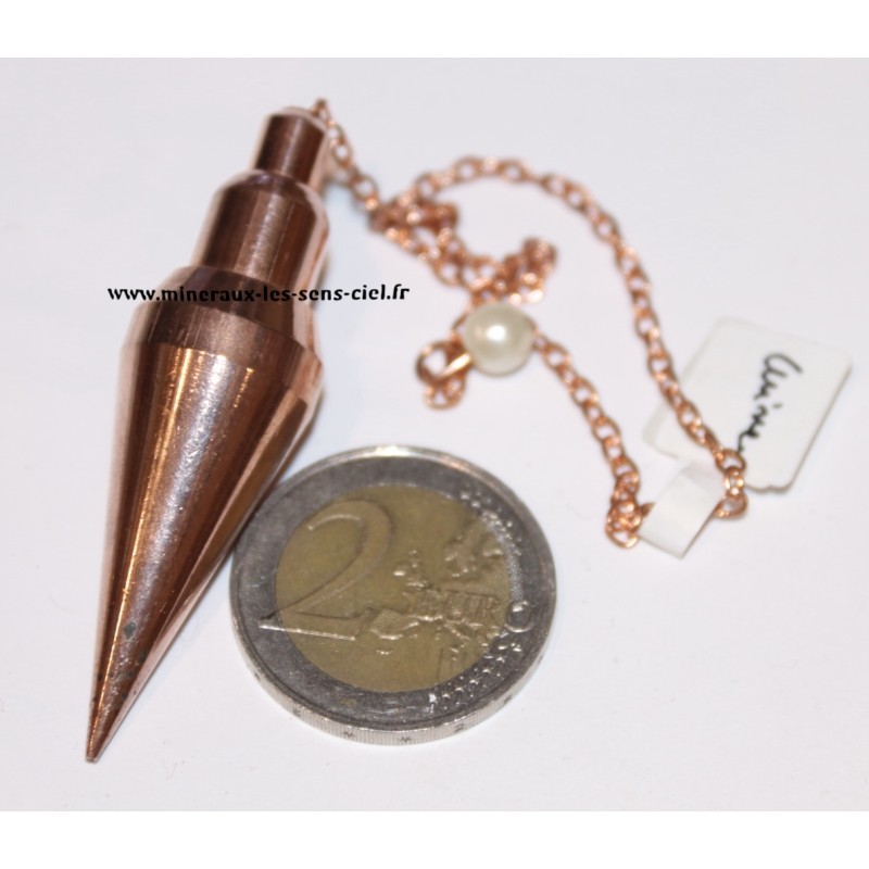 Pendule double cône métal Cuivré sur chaînette cuivrée . idéal pour s’initier à la radionique, ce pendule sera également très fiable pour tous vos autres travaux.